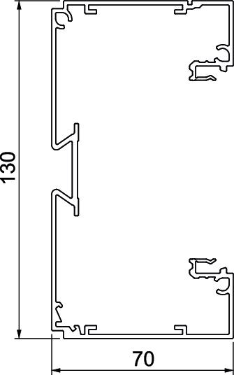 Antibacterial treatment no Base perforation With base perforation Cable retaining clip no Colour aluminium Cover mounting type Internal Cover supplied no Cover width 79 mm Dimension 70x130x2000 Duct connector no Halogen-free yes Height 70 mm Length 2000 mm Material Aluminium Mounting perforation in base yes Number of covers 1 Number of insertable partitions 1 Permitted temperature range, max. 60 °C Permitted temperature range, min. -5 °C Protection rating IP30 Protection rating IK code IK07. Protective film yes Rear panel version (inner side) Continuous DIN rail Rectangular shape yes Surface Anodised Symmetrical no Usable cross-section 7350 mm² Width 130 mm - All types