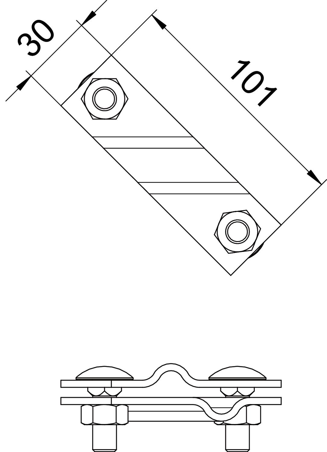 Clamping range, max. 10 mm Clamping range, min. 8 mm CO2 Footprint (GWP) Cradle-to-Gate 1,2273 kg CO2e / 1 Piece Dimension 101x30 Dimension A 101 mm Fit Rd 8-10 mm Height 35 mm Intermediate plate no Length 101 mm Lightning current carrying capacity H/100 kA Material Stainless steel 1.4571/1.4404 Suitable for connection Round conductor Rd 8–10 / Rd 8–10 Type of connector Connectors Type of fastening screw Gutter bolt Width 30 mm - All types