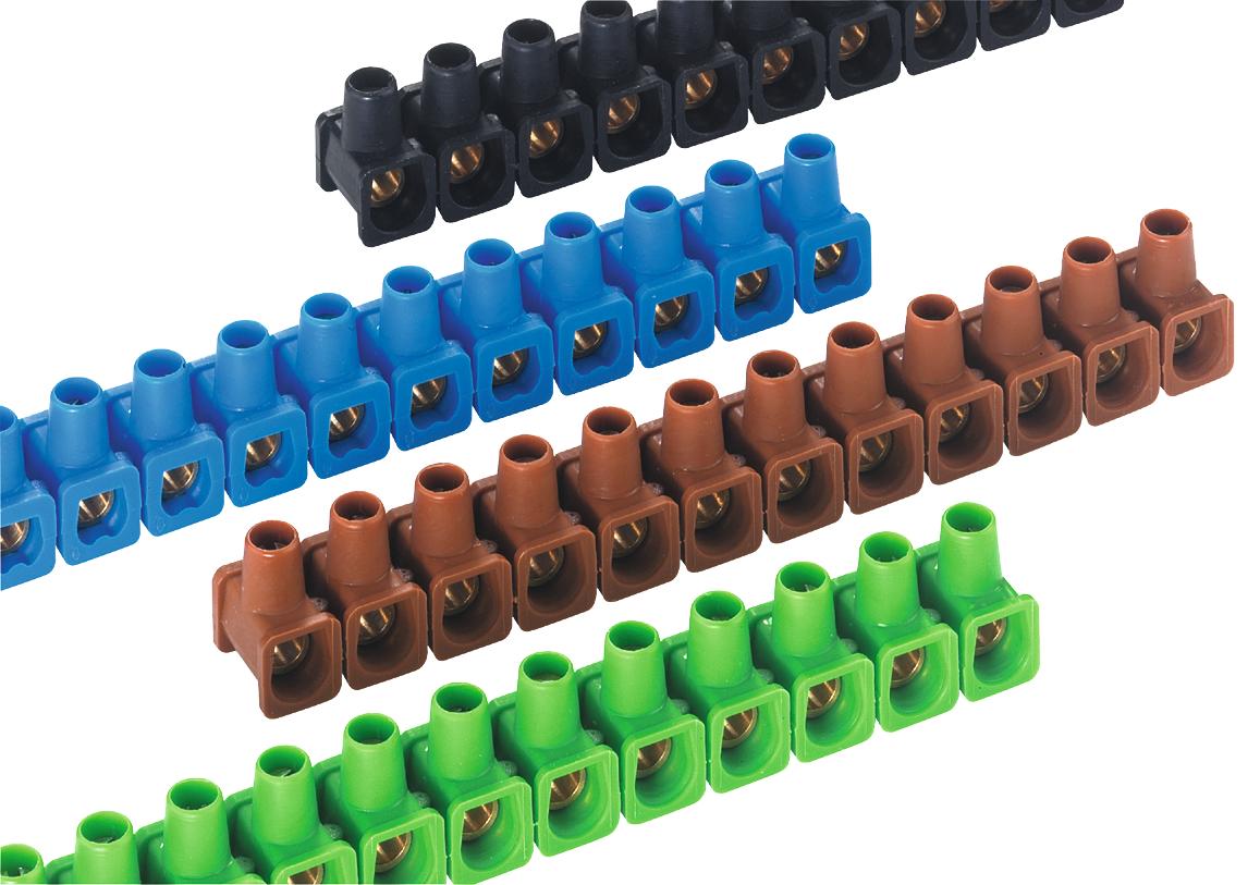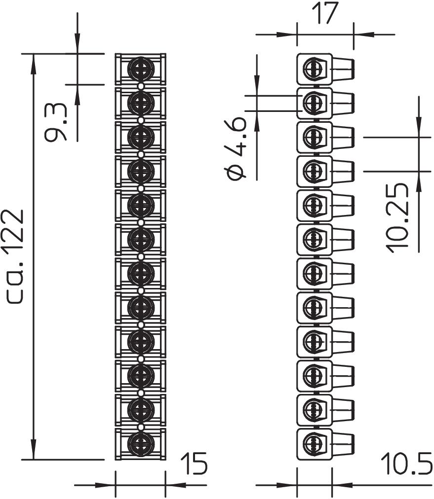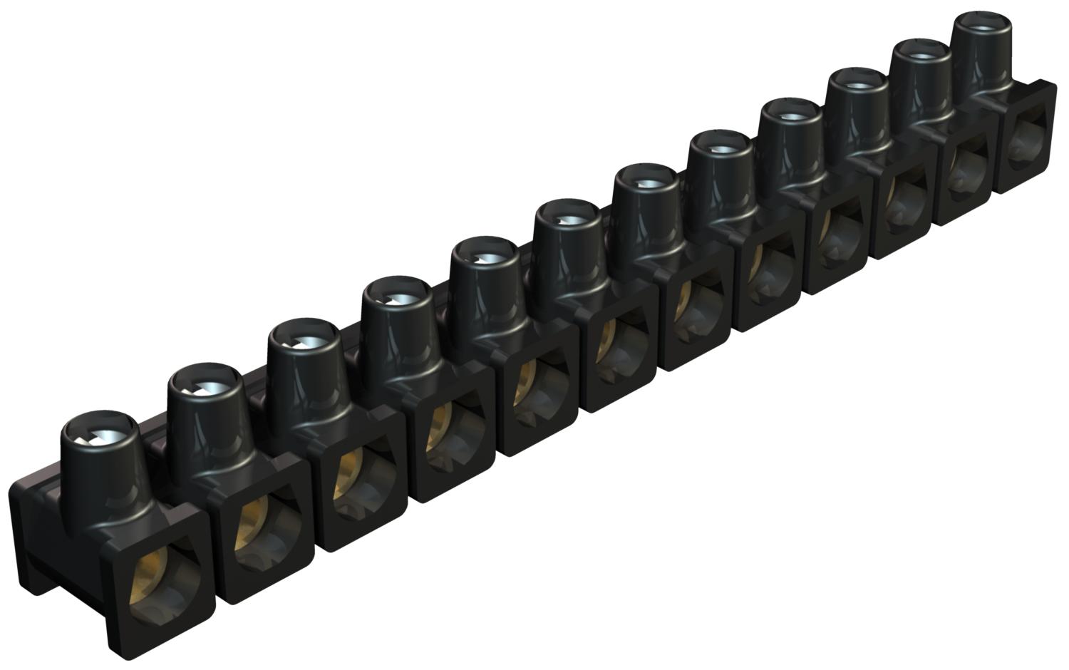 Terminals made of brass, screws of steel, galvanised and transparently passivated, 12-pole, strip separable into individual terminals, open on both sides.