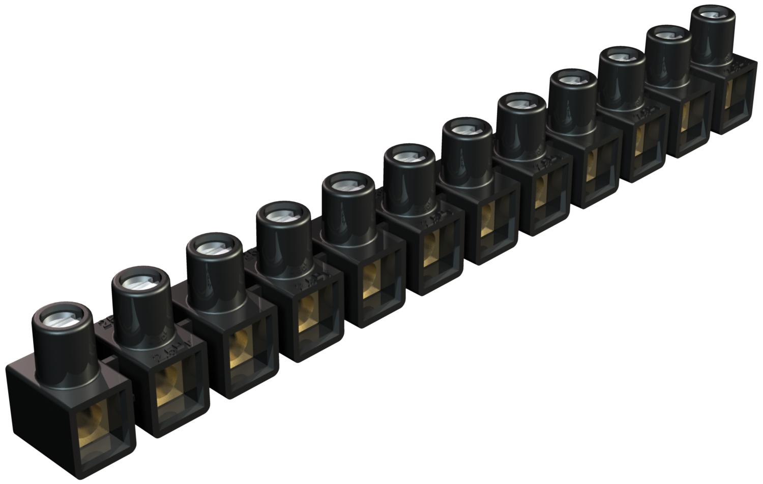 Product descriptionTerminals made of brass, screws of steel, galvanised and transparently passivated, 12-pole, strip separable into individual terminals, only open on one side.
