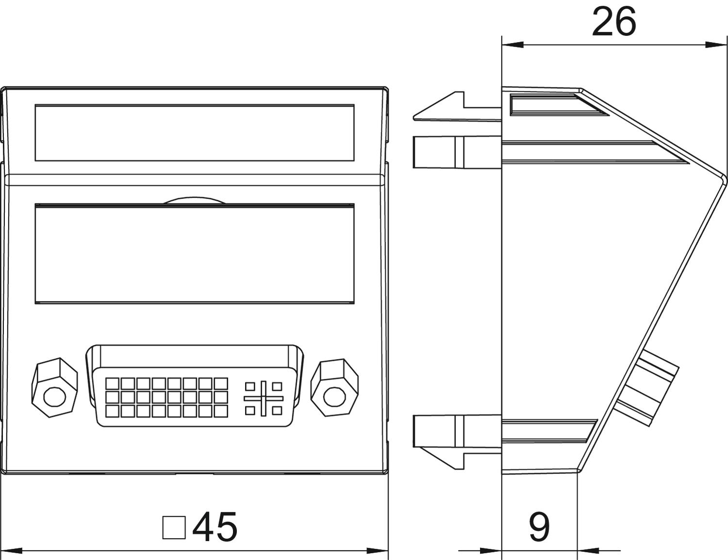 Product descriptionMultimedia support with one DVI-I connection socket, slanting cable outlet, with labelling panel, short DVI-I connection cable, socket-socket version. Support with locking fastening, suitable for horizontal and vertical installation in the system environment.