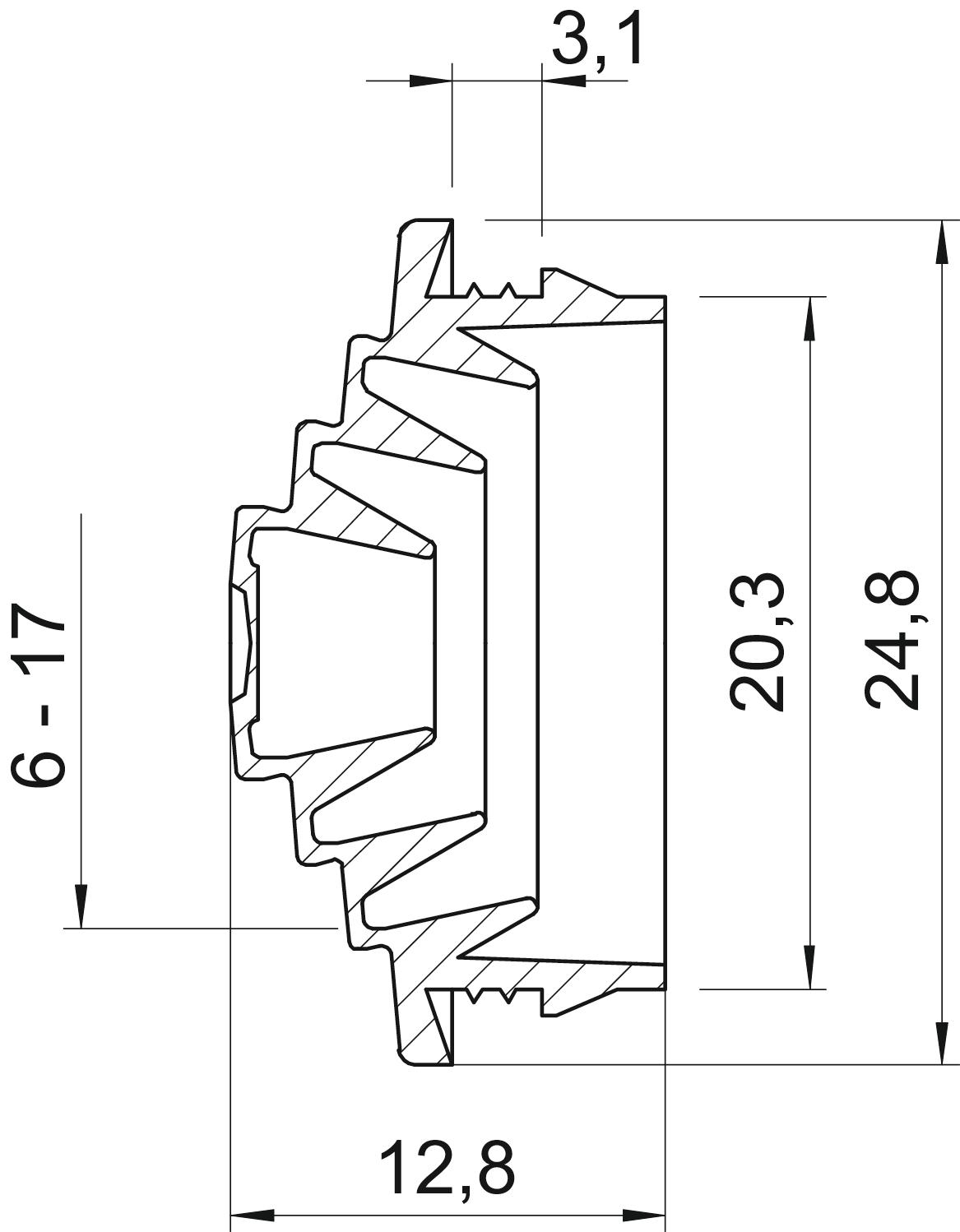 CO2 Footprint (GWP) Cradle-to-Gate 0,0078 kg CO2e / 1 Piece Colour Black Dimension M20 Dimension A 3,1 mm Dimension D1 24,8 mm Dimension D2 20,3 mm Dimension D3 6 mm Dimension D4 10 mm Dimension D5 15 mm Dimension L 12,8 mm Dimension t 3,1 mm Flame-resistant acc. to VDE 0471/DIN 695 Part 2-1, test temperature 650°C for diameter, max. 17 mm for wall thickness, max. 3,1 for wall thickness, min. 2,5 Halogen-free yes Material Thermoplastic elastomer Nominal diameter 20 mm Protection rating IP54 Size M20 Version for Cuttable - All types
