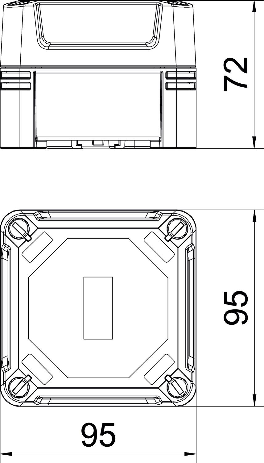 Clear internal dimensions 85x85x57 mm CO2 Footprint (GWP) Cradle-to-Gate 0,7039 kg CO2e / 1 Piece Colour Light grey; RAL 7035 Cover fastening Screwed Dimension 95x95x72 Height 72 mm Length 95 mm Material Polycarbonate Permitted temperature range, max. 60 °C Permitted temperature range, min. -5 °C Protection rating IP67 Protection rating IK code IK09 Shape Square Suitable for outdoor use yes Weatherproof yes Width 95 mm with lid yes - All types