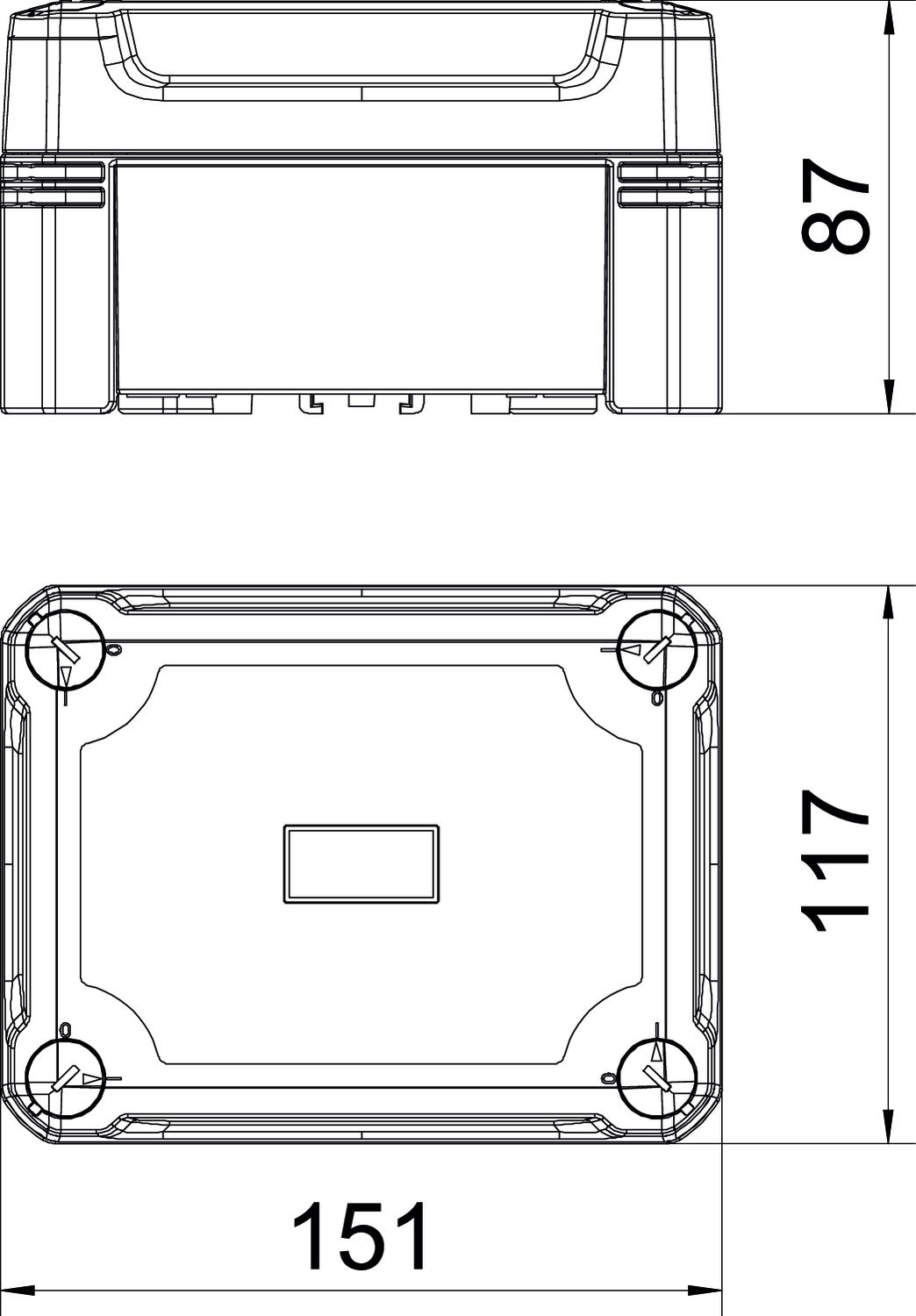 Clear internal dimensions 137x105x68 mm CO2 Footprint (GWP) Cradle-to-Gate 1,5589 kg CO2e / 1 Piece Colour Grey / transparent Cover fastening Screwed Dimension 150x116x86 Extension option no Height 86 mm Length 151 mm Material Polycarbonate Permitted temperature range, max. 60 °C Permitted temperature range, min. -5 °C Protection rating IP67 Protection rating IK code IK09 Shape Rectangular Suitable for outdoor use yes Transparent lid yes Weatherproof yes Width 117 mm with lid yes - All types