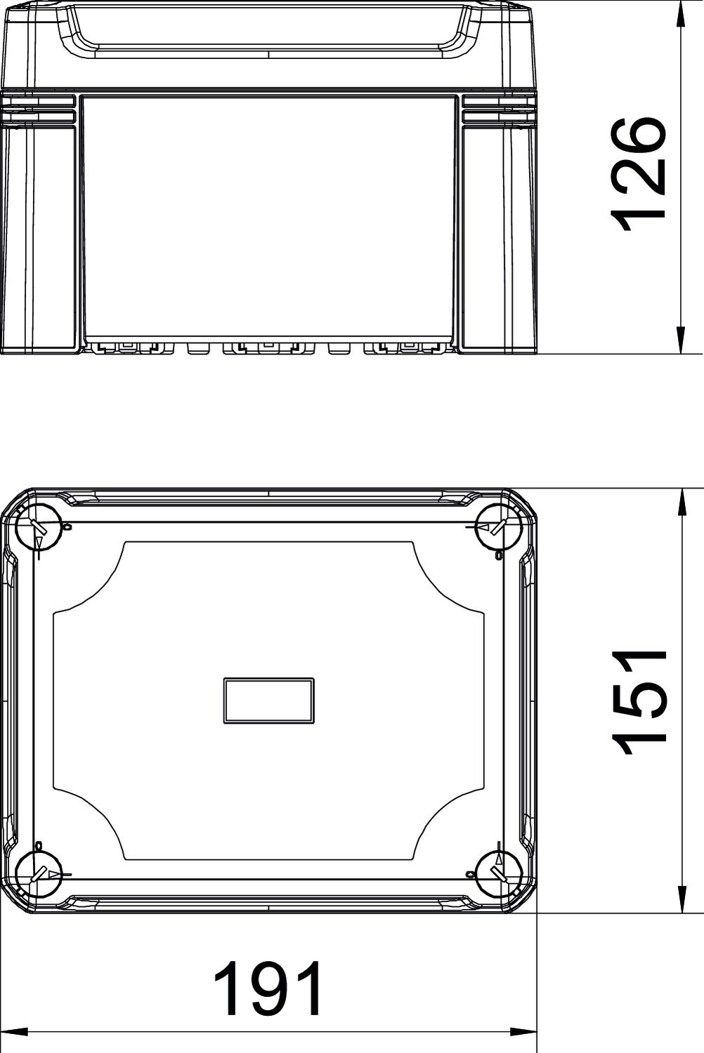Clear internal dimensions 177x137x110 mm CO2 Footprint (GWP) Cradle-to-Gate 2,4823 kg CO2e / 1 Piece Colour Light grey; RAL 7035 Cover fastening Screwed Dimension 190x150x125 Equipment Support rail Extension option no Height 126 mm Length 191 mm Material Polycarbonate Permitted temperature range, max. 60 °C Permitted temperature range, min. -5 °C Protection rating IP67 Protection rating IK code IK09 Shape Square Suitable for outdoor use yes Weatherproof yes Width 151 mm with lid yes - All types