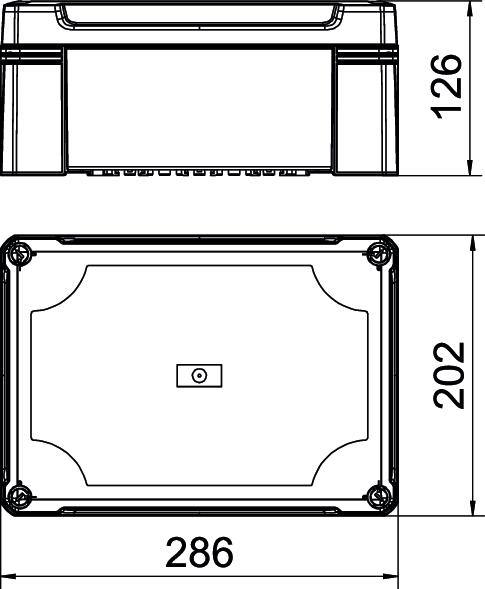 Clear internal dimensions 271x187x110 mm CO2 Footprint (GWP) Cradle-to-Gate 3,7102 kg CO2e / 1 Piece Colour Graphite black; RAL 9011 Cover fastening Screwed Dimension 286x202x125 Extension option no Height 126 mm Length 286 mm Material Polycarbonate Permitted temperature range, max. 60 °C Permitted temperature range, min. -5 °C Protection rating IP67 Protection rating IK code IK09 Shape Rectangular Suitable for outdoor use yes Weatherproof yes Width 202 mm with lid yes - All types