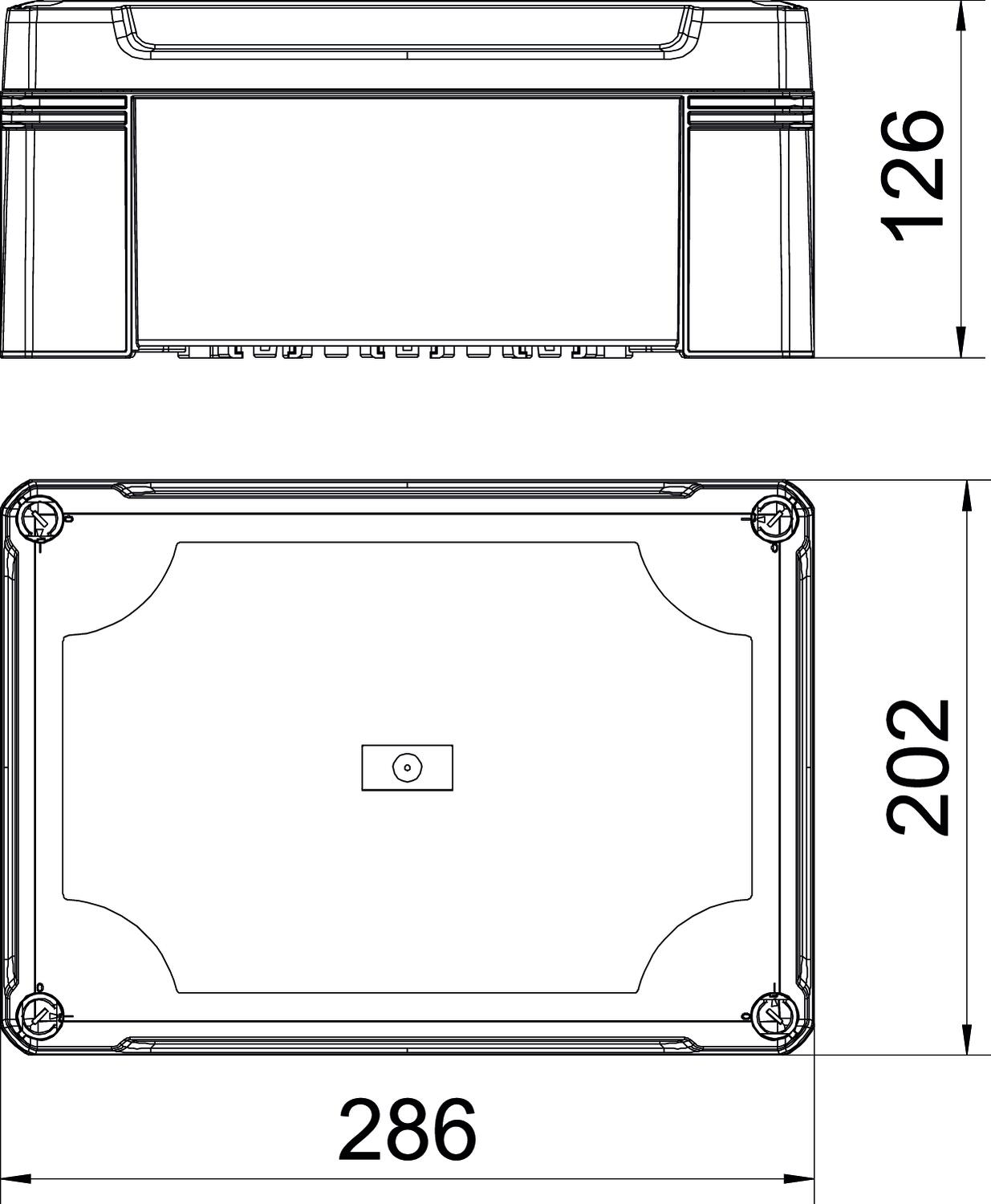 Clear internal dimensions 271x187x110 mm CO2 Footprint (GWP) Cradle-to-Gate 3,7177 kg CO2e / 1 Piece Colour Light grey; RAL 7035 Cover fastening Screwed Dimension 286x202x125 Extension option no Height 126 mm Length 286 mm Material Polycarbonate Permitted temperature range, max. 60 °C Permitted temperature range, min. -5 °C Protection rating IP67 Protection rating IK code IK09 Shape Rectangular Suitable for outdoor use yes Weatherproof yes Width 202 mm with lid yes - All types