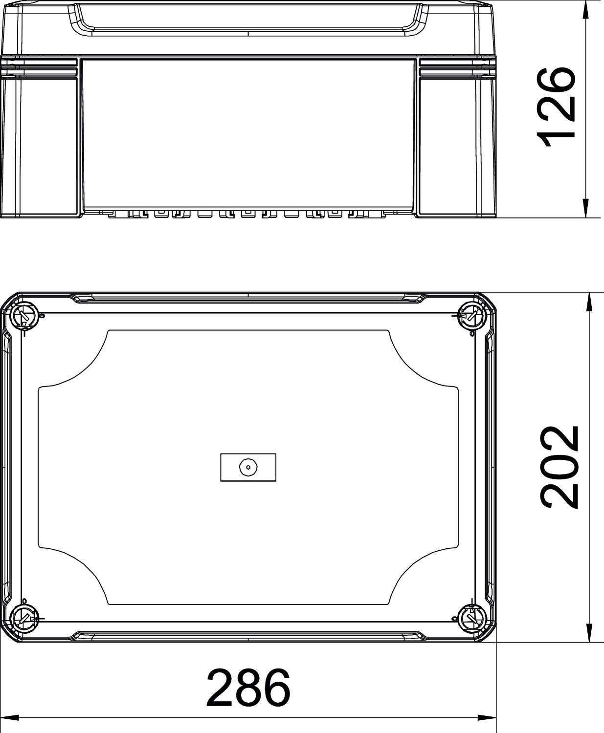 Clear internal dimensions 271x187x110 mm CO2 Footprint (GWP) Cradle-to-Gate 4,0487 kg CO2e / 1 Piece Colour Grey / transparent Cover fastening Screwed Dimension 286x202x125 Equipment Support rail Extension option no Height 126 mm Length 286 mm Material Polycarbonate Permitted temperature range, max. 60 °C Permitted temperature range, min. -5 °C Protection rating IP67 Protection rating IK code IK09 Shape Rectangular Suitable for outdoor use yes Transparent lid yes Weatherproof yes Width 202 mm with lid yes - All types
