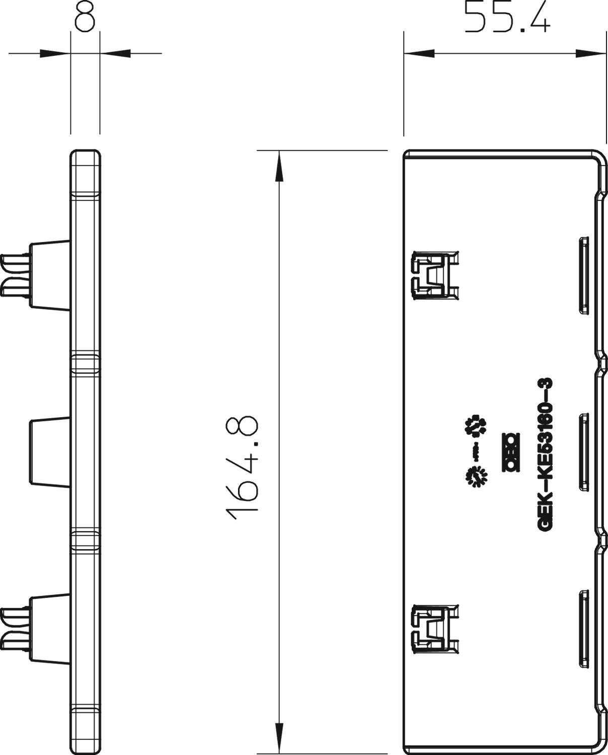 Antibacterial treatment no CO2 Footprint (GWP) Cradle-to-Gate 0,1186 kg CO2e / 1 Piece Colour Pure white; RAL 9010 Cut lamination yes Dimension 53x160mm Dimension a 164 mm Dimension b 55,4 mm Dimension H 160 mm Fastening type Lockable for trunking height 53 mm Halogen-free no Height 55,4 mm Length 8 mm Material Polyvinylchloride Permitted temperature range, max. 60 °C Permitted temperature range, min. -15 °C Protection rating IP30 Protection rating IK code IK08 Protective film no Suitable for Left/right Version for Symmetrical Width 164,8 mm - All types