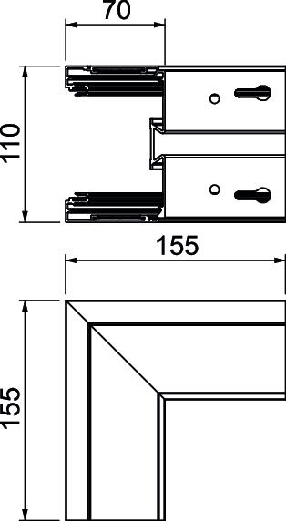 Angle range, min. 90 mm Antibacterial treatment no Cable retaining clip no CO2 Footprint (GWP) Cradle-to-Gate 11,6458 kg CO2e / 1 Piece Colour aluminium Cover mounting type Internal Cover width 79 mm Dimension 70x110x155 Duct connector no for duct width 110 mm for trunking height 70 mm Halogen-free yes Height 70 mm Length 155 mm Material Aluminium Mounting perforation in base yes Number of covers 1 Permitted temperature range, max. 60 °C Permitted temperature range, min. -5 °C Protection rating IP30 Protection rating IK code IK07. Protective film yes Surface Anodised Symmetrical no Version for Base Width 110 mm - All types