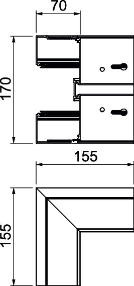 Angle range, min. 90 mm Antibacterial treatment no Cable retaining clip no CO2 Footprint (GWP) Cradle-to-Gate 15,7167 kg CO2e / 1 Piece Colour aluminium Cover mounting type Internal Cover width 79 mm Dimension 70x170x155 Duct connector no for duct width 170 mm for trunking height 70 mm Halogen-free yes Height 70 mm Length 155 mm Material Aluminium Mounting perforation in base yes Number of covers 1 Permitted temperature range, max. 60 °C Permitted temperature range, min. -5 °C Protection rating IP30 Protection rating IK code IK07. Protective film yes Surface Anodised Symmetrical no Version for Base Width 170 mm - All types