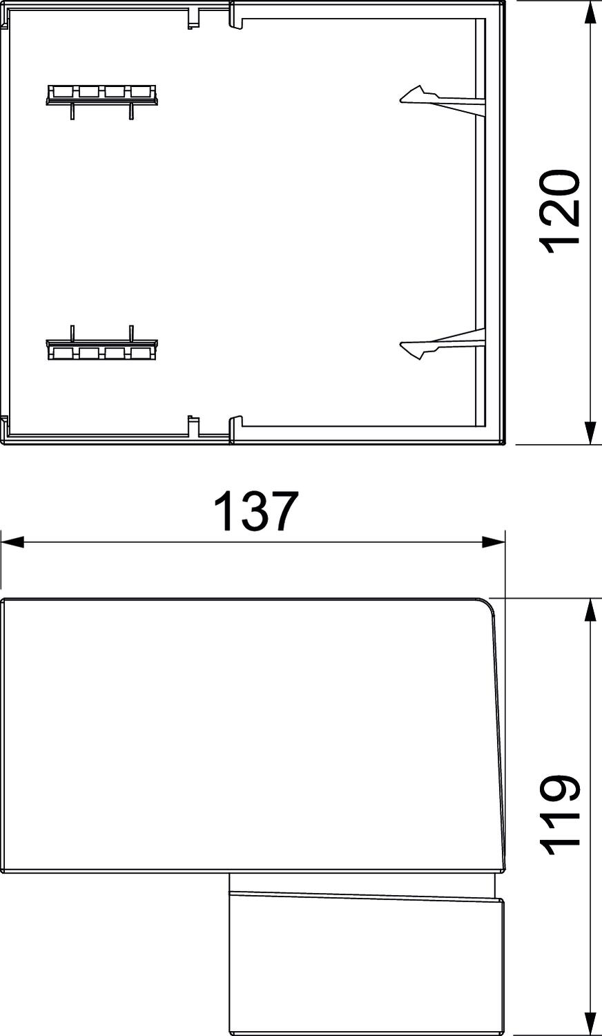 Angle range, max. 93 mm Angle range, min. 85 mm Antibacterial treatment no Cable retaining clip no CO2 Footprint (GWP) Cradle-to-Gate 1,0788 kg CO2e / 1 Piece Colour Pure white; RAL 9010 Cover mounting type Cross-over Dimension 119x137x120 Duct connector no Halogen-free yes Height 120 mm Length 119 mm Material Polycarbonate/Acrylnitrile-butadiene-styrene Mounting perforation in base no Permitted temperature range, max. 60 °C Permitted temperature range, min. -5 °C Protection rating IP40 Protection rating IK code IK07. Protective film no Symmetrical no Version for Hood fitting Width 137 mm - All types
