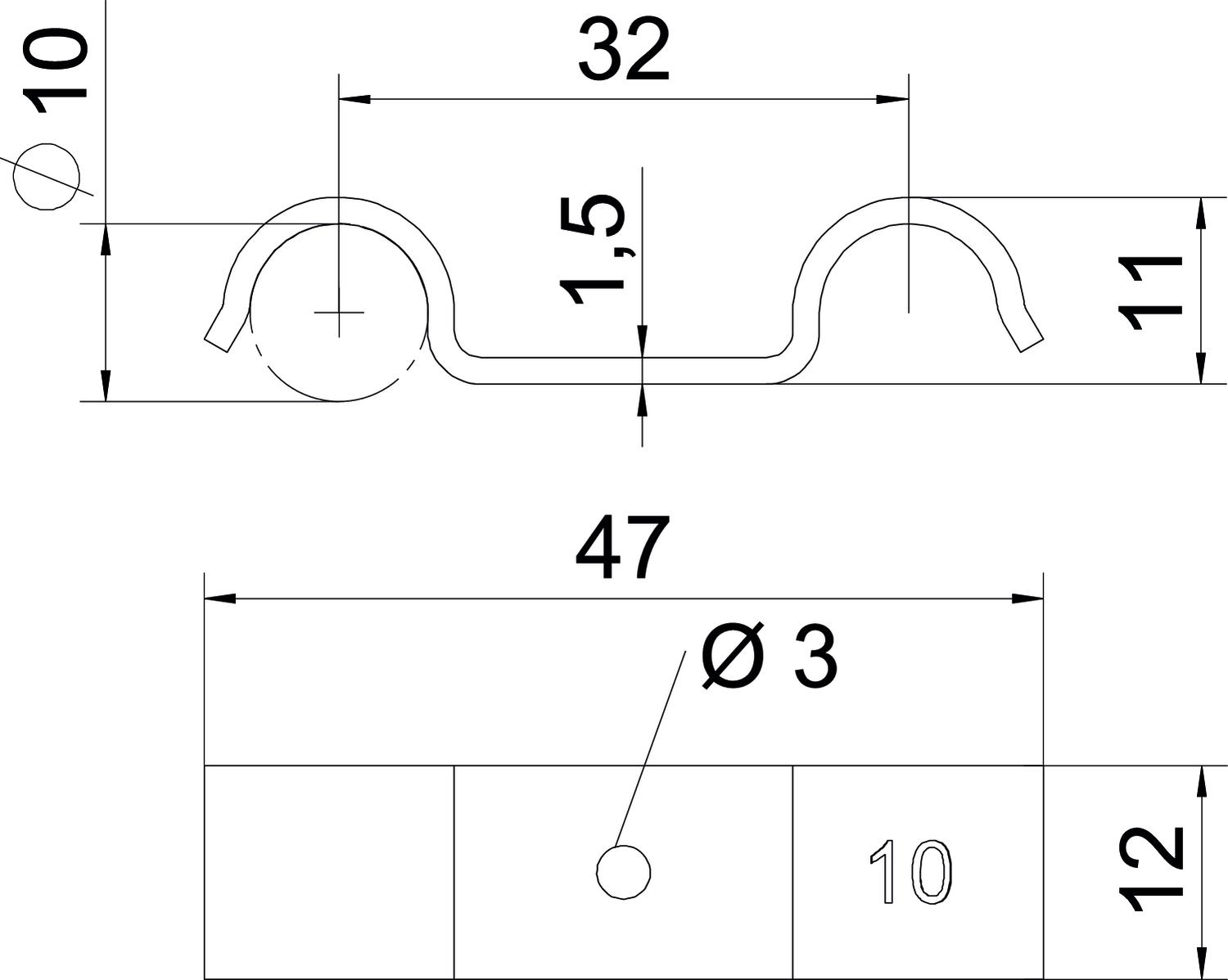 CO2 Footprint (GWP) Cradle-to-Gate 0,0116 kg CO2e / 1 Piece Dimension 10mm Dimension B 12 mm Dimension H 9 mm Distance to the wall no Fastening type Miscellaneous For diameter 10 Halogen-free yes Height 10,5 mm Length 47 mm Material Steel Material thickness 1,5 mm Number of cables/pipes 2 Plastic-covered no Suitable in fire protection area yes Surface Electrogalvanized UV-resistant yes Version for Single-lobe Width 12 mm - All types
