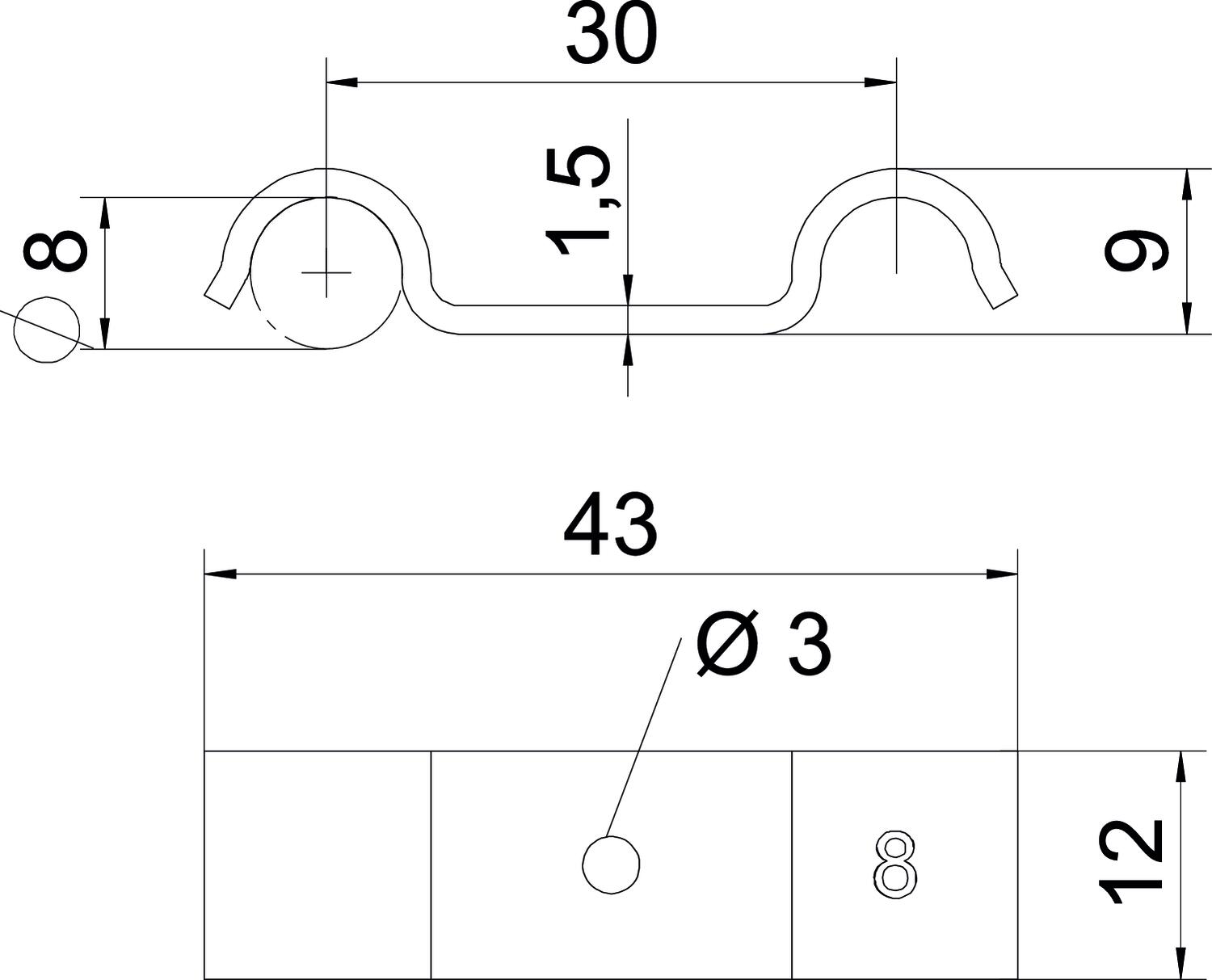 CO2 Footprint (GWP) Cradle-to-Gate 0,0101 kg CO2e / 1 Piece Dimension 8mm Dimension B 12 mm Dimension H 7 mm Distance to the wall no Fastening type Miscellaneous For diameter 8 Halogen-free yes Height 8,5 mm Length 43 mm Material Steel Material thickness 1,5 mm Number of cables/pipes 2 Plastic-covered no Suitable in fire protection area yes Surface Electrogalvanized UV-resistant yes Version for Single-lobe Width 12 mm - All types