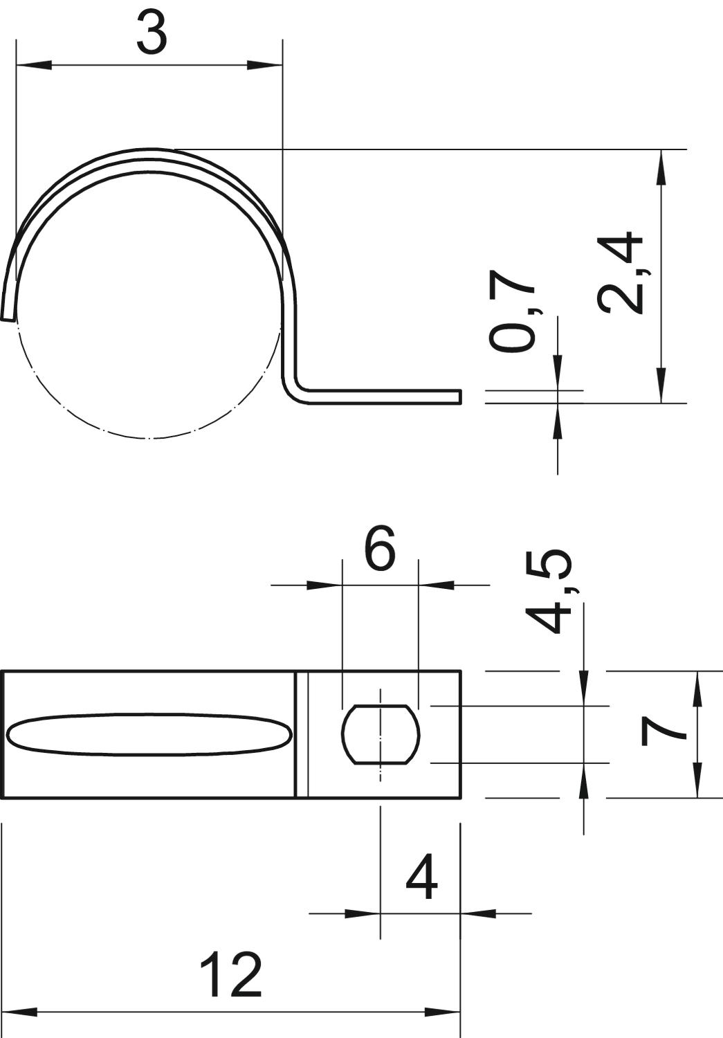 CO2 Footprint (GWP) Cradle-to-Gate 0,0023 kg CO2e / 1 Piece Dimension 3mm Dimension A 4 mm Dimension b 7 mm Dimension d 4,5 mm Dimension D 3 mm Dimension e 6 mm Dimension H 2,4 mm Dimension L 12 mm Dimension t 0,7 mm Distance to the wall no Fastening type Screw hole For diameter 3 Halogen-free yes Height 2,4 mm Hole size 4,5 x 6 mm Length 12 mm Material Steel Material thickness 0,7 mm Nominal diameter 3 mm Number of cables/pipes 1 Plastic-covered no Suitable in fire protection area no Surface Electrogalvanized UV-resistant yes Version for Single-lobe Width 7 mm - All types