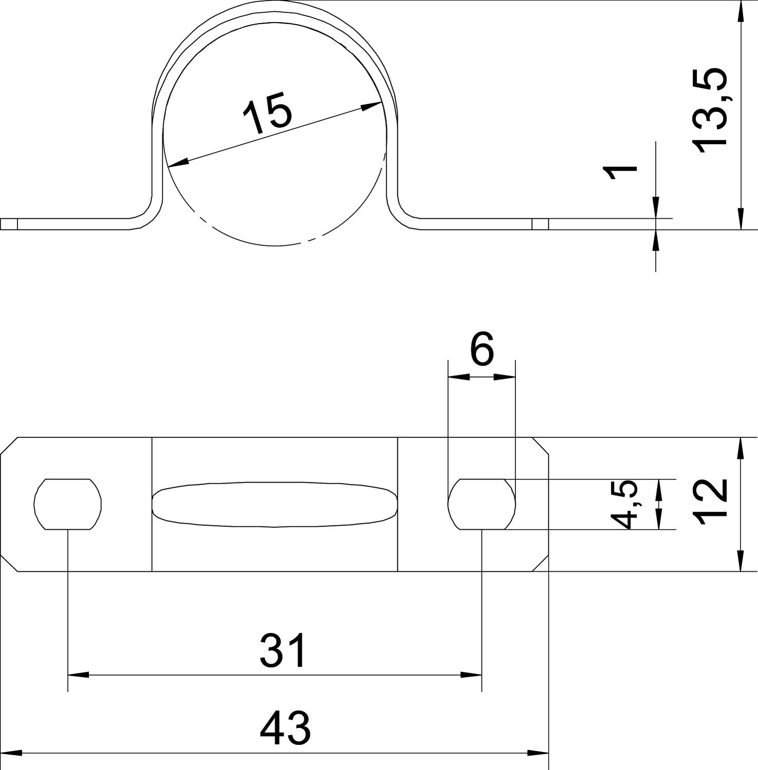 CO2 Footprint (GWP) Cradle-to-Gate 0,0123 kg CO2e / 1 Piece Dimension 15mm Dimension A 43 mm Dimension b 12 mm Dimension B 31 mm Dimension d 4,5 mm Dimension D 15 mm Dimension e 6 mm Dimension H 13,5 mm Dimension t 1 mm Distance to the wall no Fastening type Screw hole For diameter 15 Halogen-free yes Height 13,5 mm Hole size 4,5 x 6 mm Length 43 mm Material Steel Material thickness 1 mm Nominal diameter 15 mm Number of cables/pipes 1 Plastic-covered no Suitable in fire protection area no Surface Electrogalvanized UV-resistant yes Version for Two-lobe Width 12 mm - All types