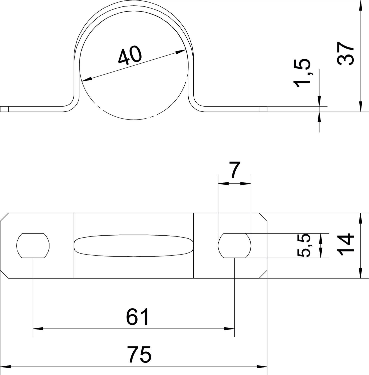 CO2 Footprint (GWP) Cradle-to-Gate 0,1382 kg CO2e / 1 Piece Dimension 40mm Dimension A 75 mm Dimension B 61 mm Dimension b 14 mm Dimension d 5,5 mm Dimension D 40 mm Dimension e 7 mm Dimension H 37 mm Dimension t 1,5 mm Distance to the wall no Fastening type Screw hole For diameter 40 Halogen-free yes Height 37 mm Hole size 5,5 x 7 mm Length 75 mm Material Stainless steel 1.4571 Material thickness 1,5 mm Nominal diameter 40 mm Number of cables/pipes 1 Plastic-covered no Suitable in fire protection area no Surface Bright, treated UV-resistant yes Version for Two-lobe Width 14 mm - All types