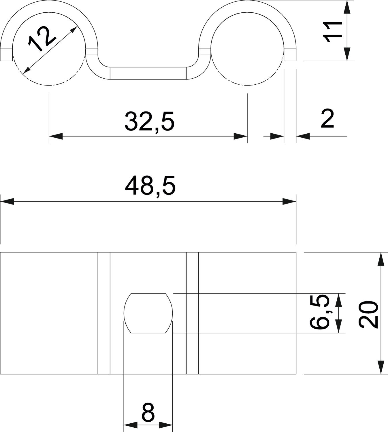 CO2 Footprint (GWP) Cradle-to-Gate 0,0992 kg CO2e / 1 Piece Dimension 12mm Dimension A 48,5 mm Dimension b 20 mm Dimension D 12 mm Dimension d 6,5 mm Dimension e 8 mm Dimension L 16 mm Dimension t 2 mm Distance to the wall no For diameter 12 Halogen-free yes Height 11 mm Material Stainless steel 1.4301 Plastic-covered no Suitable in fire protection area no Surface Bright, treated UV-resistant yes - All types