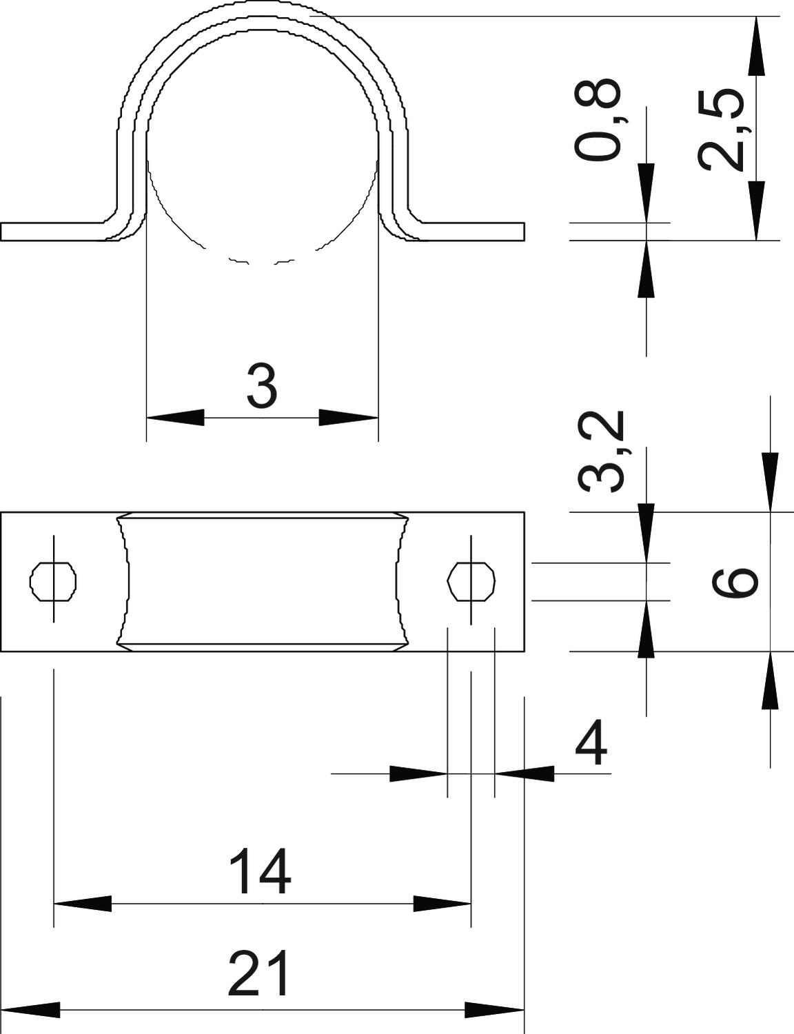CO2 Footprint (GWP) Cradle-to-Gate 0,0021 kg CO2e / 1 Piece Dimension 3mm Dimension A 21 mm Dimension B 14 mm Dimension b 6 mm Dimension D 3 mm Dimension d 3,2 mm Dimension e 4 mm Dimension H 2,5 mm Dimension L 21 mm Dimension t 0,8 mm Distance to the wall no Fastening type Screw hole For diameter 3 Halogen-free yes Height 2,5 mm Hole size 3,2 x 4 mm Length 21 mm Material Steel Material thickness 0,8 mm Nominal diameter 3 mm Number of cables/pipes 1 Plastic-covered no Suitable in fire protection area no Surface Electrogalvanized, transparently passivated UV-resistant yes Version for Two-lobe Width 6 mm - All types