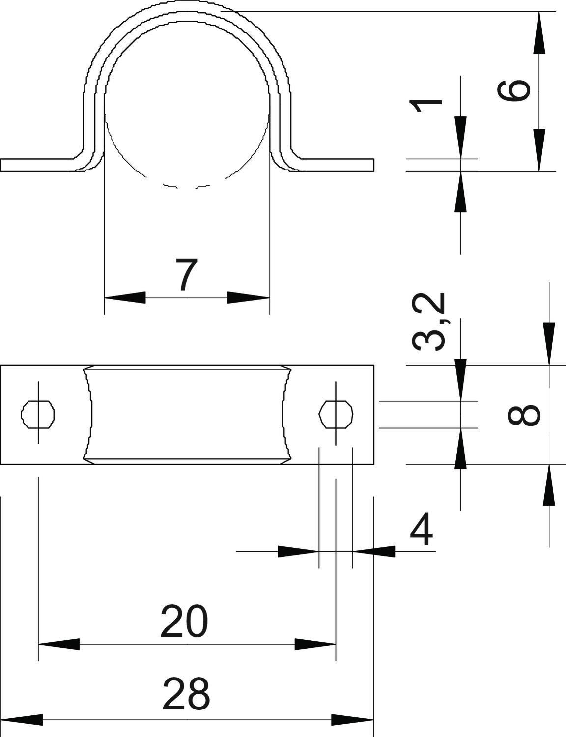 CO2 Footprint (GWP) Cradle-to-Gate 0,0049 kg CO2e / 1 Piece Dimension 7mm Dimension A 28 mm Dimension B 20 mm Dimension b 8 mm Dimension D 7 mm Dimension d 3,2 mm Dimension e 4 mm Dimension H 6 mm Dimension L 28 mm Dimension t 1 mm Distance to the wall no Fastening type Screw hole For diameter 7 Halogen-free yes Height 6 mm Hole size 3,2 x 4 mm Length 28 mm Material Steel Material thickness 1 mm Nominal diameter 7 mm Number of cables/pipes 1 Plastic-covered no Suitable in fire protection area no Surface Electrogalvanized, transparently passivated UV-resistant yes Version for Two-lobe Width 8 mm - All types