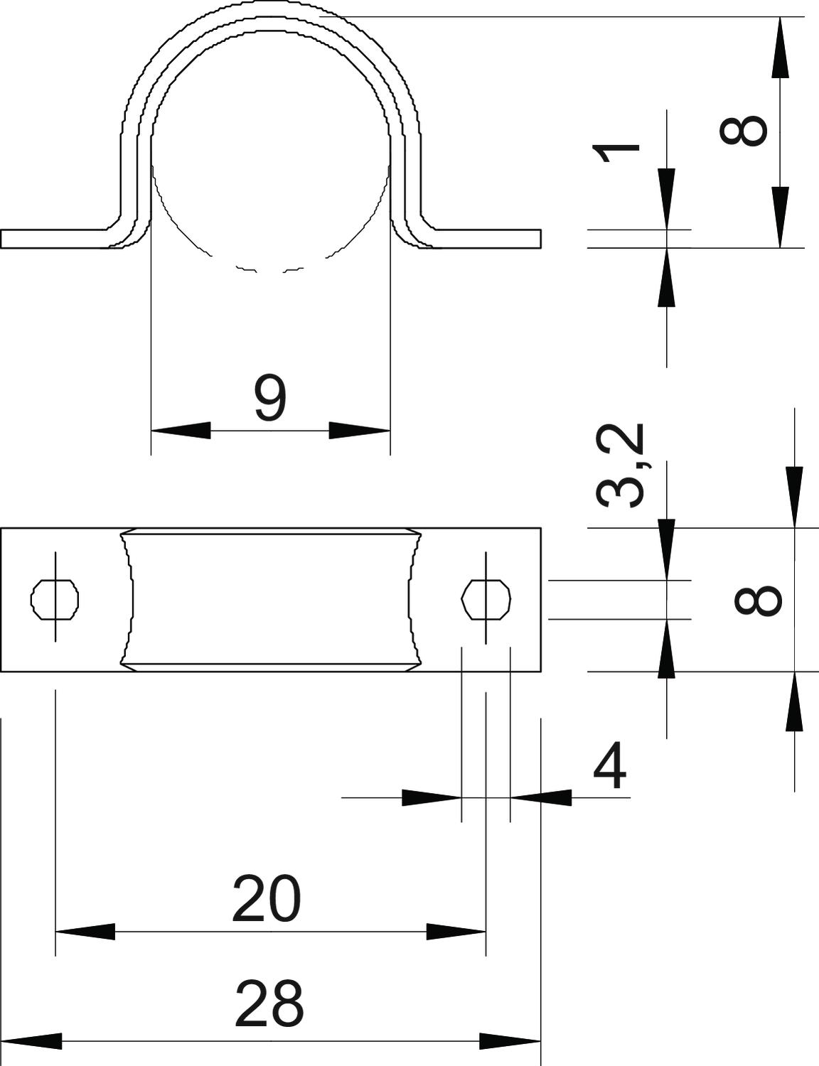 CO2 Footprint (GWP) Cradle-to-Gate 0,0052 kg CO2e / 1 Piece Dimension 9mm Dimension A 28 mm Dimension b 8 mm Dimension B 20 mm Dimension D 9 mm Dimension d 3,2 mm Dimension e 4 mm Dimension H 8 mm Dimension L 28 mm Dimension t 1 mm Distance to the wall no Fastening type Screw hole For diameter 9 Halogen-free yes Height 8 mm Hole size 3,2 x 4 mm Length 28 mm Material Steel Material thickness 1,5 mm Nominal diameter 9 mm Number of cables/pipes 1 Plastic-covered no Suitable in fire protection area no Surface Electrogalvanized, transparently passivated UV-resistant yes Version for Two-lobe Width 8 mm - All types