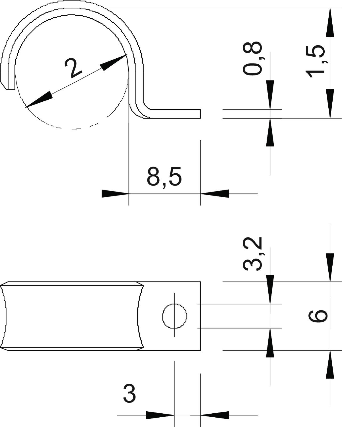 CO2 Footprint (GWP) Cradle-to-Gate 0,0019 kg CO2e / 1 Piece Dimension 2mm Dimension A 3 mm Dimension b 6 mm Dimension d 3,2 mm Dimension D 2 mm Dimension H 1,5 mm Dimension L 8,5 mm Dimension t 0,8 mm Distance to the wall no Fastening type Screw hole For diameter 2 Halogen-free yes Height 1,5 mm Hole size 3,2 mm Length 8,5 mm Material Steel Material thickness 0,8 mm Nominal diameter 2 mm Number of cables/pipes 1 Plastic-covered no Suitable in fire protection area no Surface Electrogalvanized, transparently passivated UV-resistant yes Version for Single-lobe Width 6 mm - All types