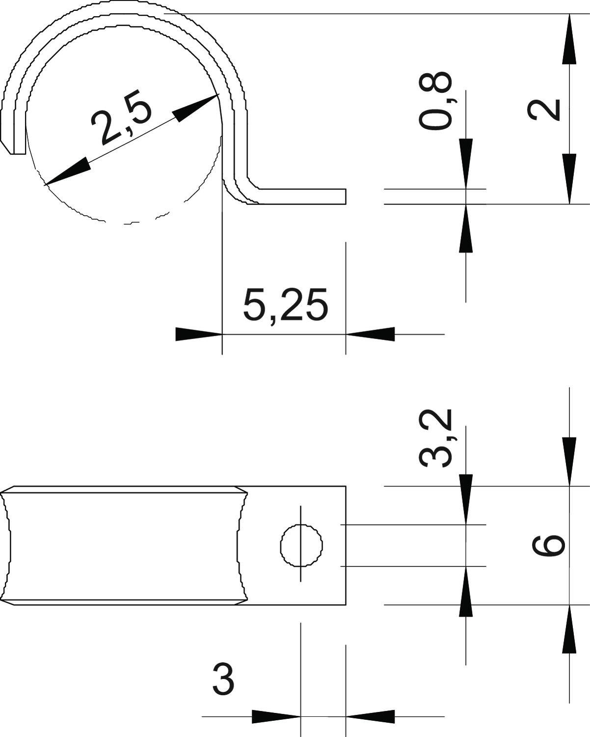 CO2 Footprint (GWP) Cradle-to-Gate 0,0014 kg CO2e / 1 Piece Dimension 2,5mm Dimension A 3 mm Dimension b 6 mm Dimension D 2,5 mm Dimension d 3,2 mm Dimension H 2 mm Dimension L 5,25 mm Dimension t 0,8 mm Distance to the wall no Fastening type Screw hole For diameter 2,5 Halogen-free yes Height 2 mm Hole size 3,2 mm Length 5,25 mm Material Steel Material thickness 0,8 mm Nominal diameter 2,5 mm Number of cables/pipes 1 Plastic-covered no Suitable in fire protection area no Surface Electrogalvanized, transparently passivated UV-resistant yes Version for Single-lobe Width 6 mm - All types