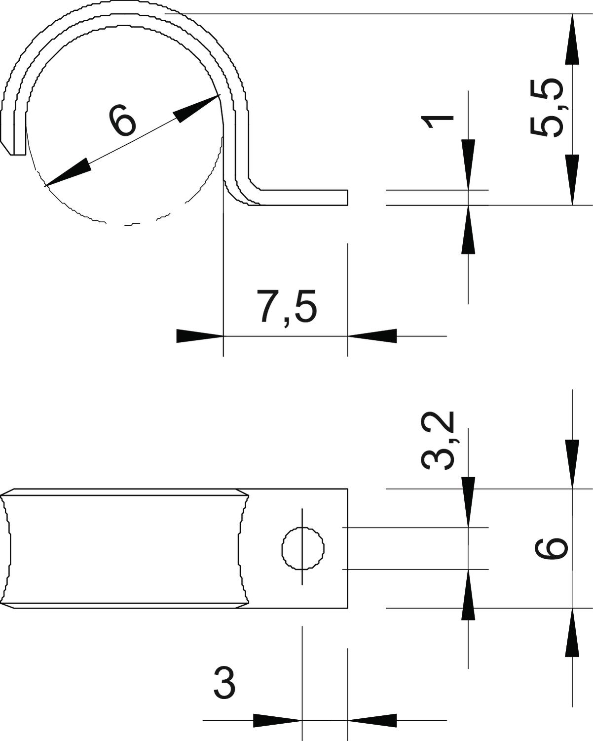 CO2 Footprint (GWP) Cradle-to-Gate 0,0029 kg CO2e / 1 Piece Dimension 6mm Dimension A 3 mm Dimension b 6 mm Dimension d 3,2 mm Dimension D 6 mm Dimension H 5,5 mm Dimension L 7,5 mm Dimension t 1 mm Distance to the wall no Fastening type Screw hole For diameter 6 Halogen-free yes Height 5,5 mm Hole size 3,2 mm Length 7,5 mm Material Steel Material thickness 1 mm Nominal diameter 6 mm Number of cables/pipes 1 Plastic-covered no Suitable in fire protection area no Surface Electrogalvanized, transparently passivated UV-resistant yes Version for Single-lobe Width 6 mm - All types