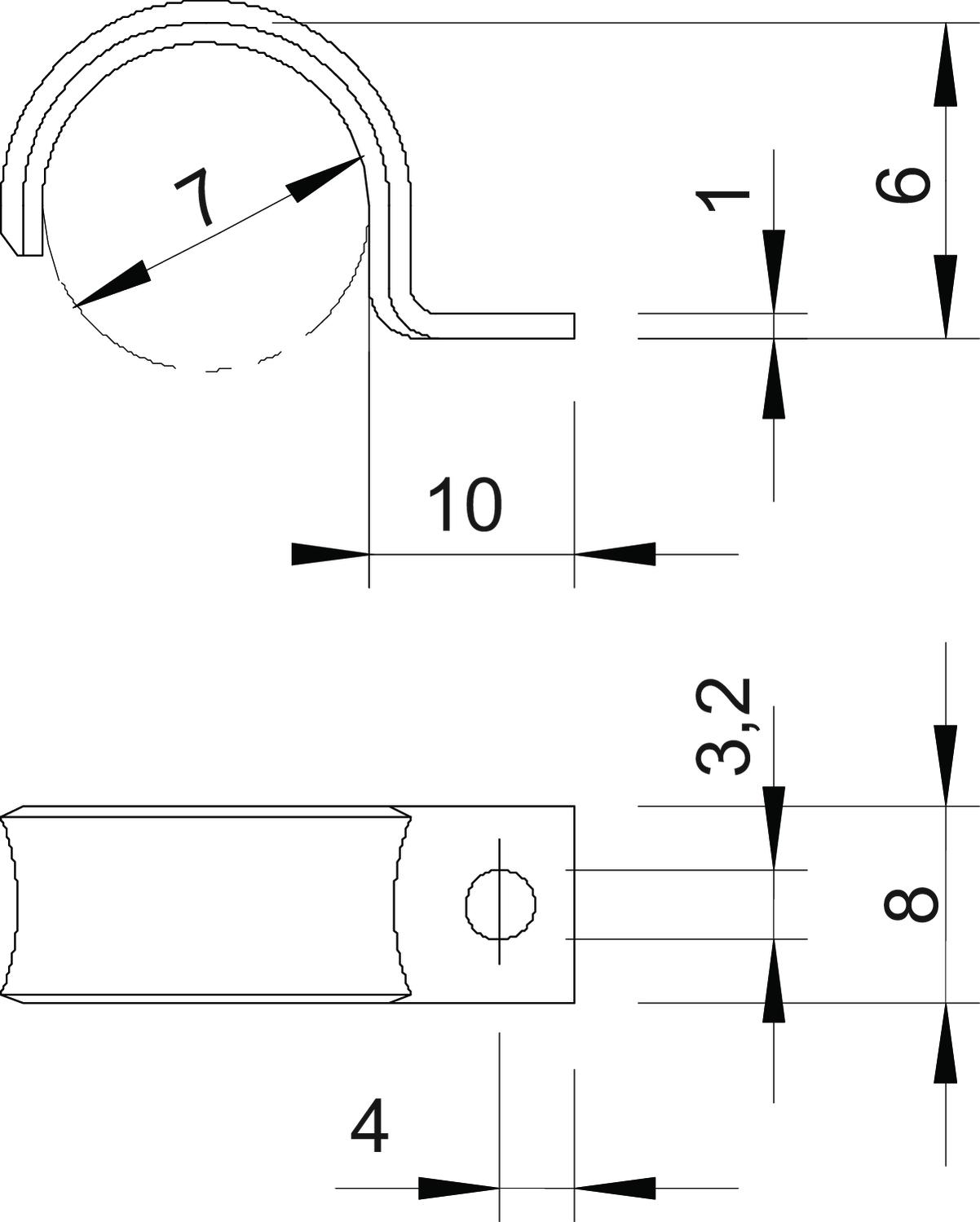 CO2 Footprint (GWP) Cradle-to-Gate 0,004 kg CO2e / 1 Piece Dimension 7mm Dimension A 4 mm Dimension b 8 mm Dimension D 7 mm Dimension d 3,2 mm Dimension H 6 mm Dimension L 10 mm Dimension t 1 mm Distance to the wall no Fastening type Screw hole For diameter 7 Halogen-free yes Height 6 mm Hole size 3,2 mm Length 10 mm Material Steel Material thickness 1 mm Nominal diameter 7 mm Number of cables/pipes 1 Plastic-covered no Suitable in fire protection area no Surface Electrogalvanized, transparently passivated UV-resistant yes Version for Single-lobe Width 8 mm - All types