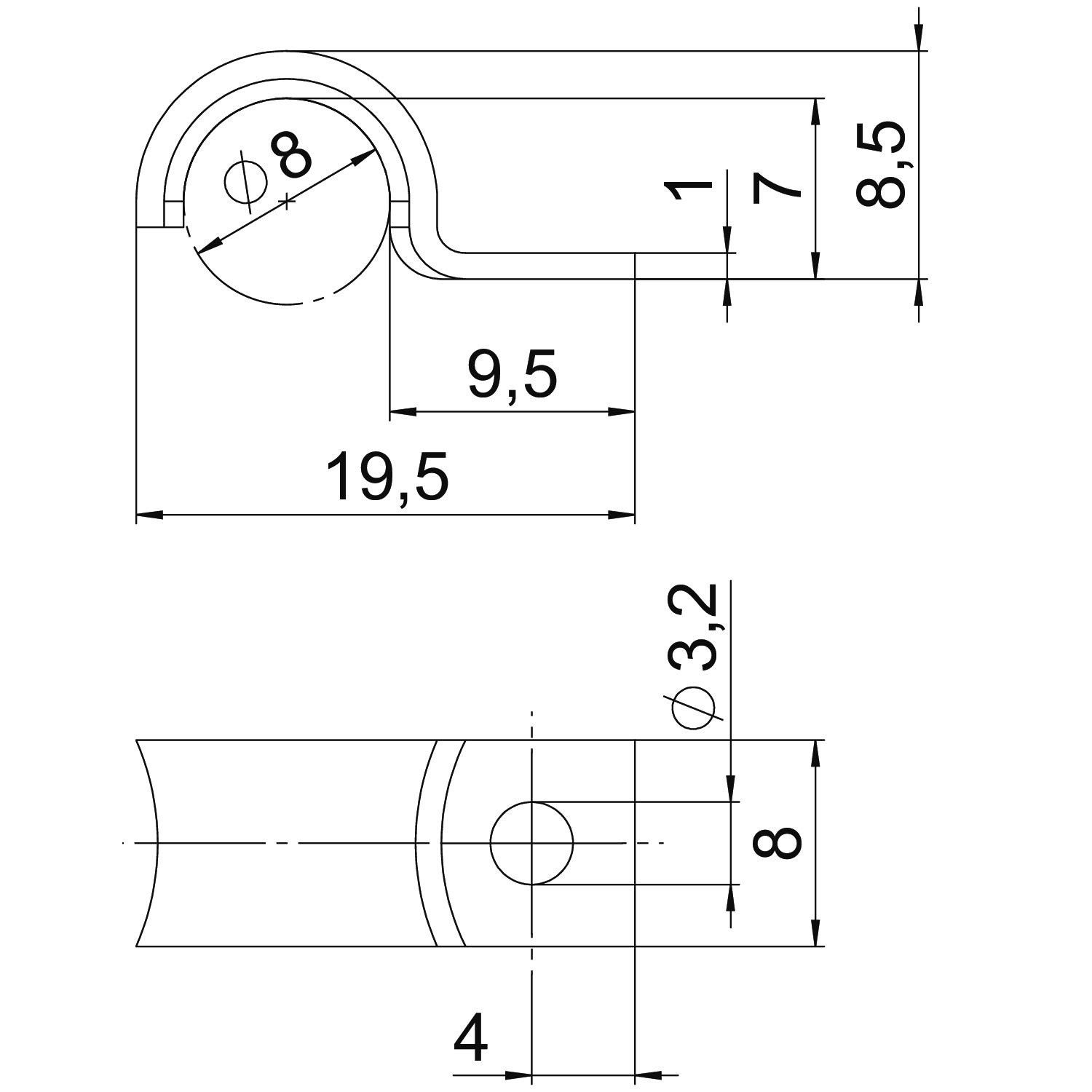 CO2 Footprint (GWP) Cradle-to-Gate 0,004 kg CO2e / 1 Piece Dimension 8mm Dimension A 4 mm Dimension b 8 mm Dimension D 8 mm Dimension d 3,2 mm Dimension H 7 mm Dimension L 9,5 mm Dimension t 1 mm Distance to the wall no Fastening type Screw hole For diameter 8 Halogen-free yes Height 8,5 mm Hole size 3,2 mm Length 19,5 mm Material Steel Material thickness 1 mm Nominal diameter 8 mm Number of cables/pipes 1 Plastic-covered no Suitable in fire protection area no Surface Electrogalvanized, transparently passivated UV-resistant yes Version for Single-lobe Width 8 mm - All types