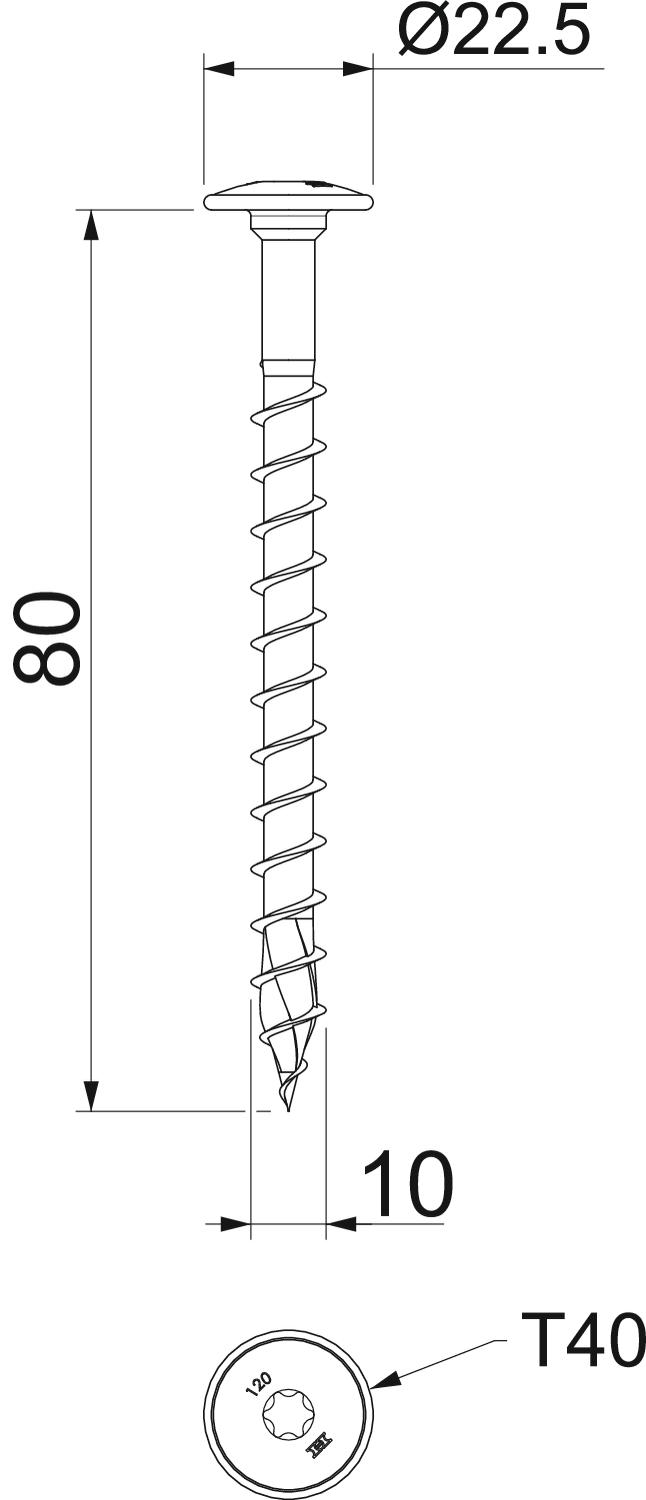 Colour zinc Dimension 10x80 Dimension D 10 mm Dimension L 80 mm Hardened yes Head diameter 22,5 mm Head shape Plate head Length 80 mm Material Steel Screw system Torx Shank diameter 7 mm Surface Electrogalvanized Two-compartment no - All types