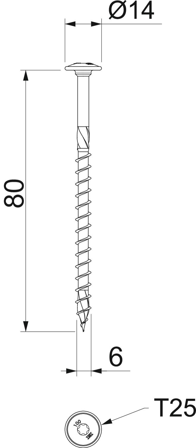 Colour zinc Dimension 6x80 Dimension D 6 mm Dimension L 80 mm Hardened yes Head diameter 14 mm Head shape Plate head Length 80 mm Material Steel Screw system Torx Shank diameter 4,5 mm Surface Electrogalvanized Two-compartment no - All types