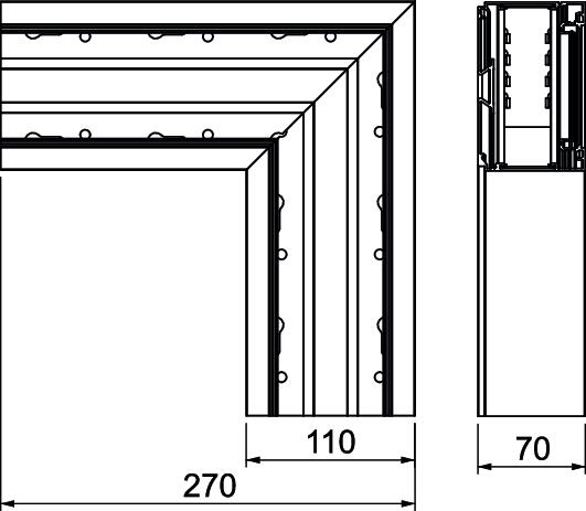 Angle range, min. 90 mm Antibacterial treatment no Cable retaining clip no Change of direction Vertical, falling CO2 Footprint (GWP) Cradle-to-Gate 18,8176 kg CO2e / 1 Piece Colour aluminium Cover mounting type Internal Cover width 79 mm Dimension 70x110x270 Duct connector no for duct width 110 mm for trunking height 70 mm Halogen-free yes Height 70 mm Length 270 mm Material Aluminium Mounting perforation in base yes Number of covers 1 Permitted temperature range, max. 60 °C Permitted temperature range, min. -5 °C Protection rating IP30 Protection rating IK code IK07. Protective film yes Surface Anodised Symmetrical no Version for Base Width 110 mm - All types