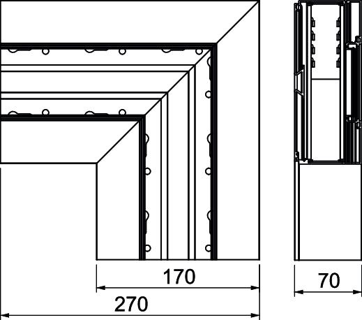 Angle range, min. 90 mm Antibacterial treatment no Cable retaining clip no Change of direction Vertical, falling CO2 Footprint (GWP) Cradle-to-Gate 24,8591 kg CO2e / 1 Piece Colour aluminium Cover mounting type Internal Cover width 79 mm Dimension 70x170x270 Duct connector no for duct width 170 mm for trunking height 70 mm Halogen-free yes Height 70 mm Length 270 mm Material Aluminium Mounting perforation in base yes Number of covers 1 Permitted temperature range, max. 60 °C Permitted temperature range, min. -5 °C Protection rating IP30 Protection rating IK code IK07. Protective film yes Surface Anodised Symmetrical no Version for Base Width 170 mm - All types