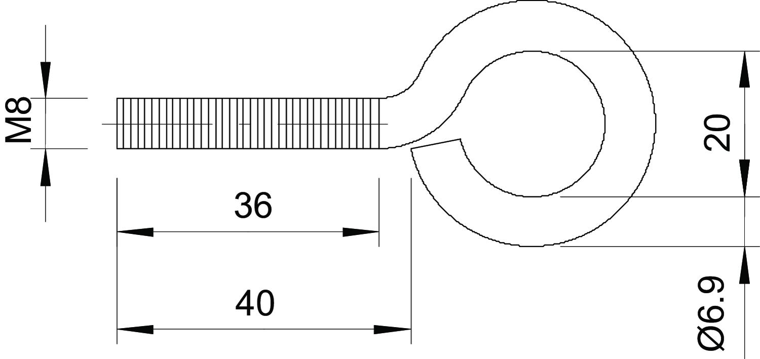 Breaking load 2 kN Dimension M8x40mm hook diameter 20 mm Length 70 mm Material Steel Plastic-covered no Shank length 40 Surface Electrogalvanized Thread M8 Thread length 36 mm - All types