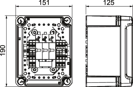 • 1 protection device with 5 push-in terminals of up to 6 mm² pre-installed in the housing, up to 41 A DC per terminal