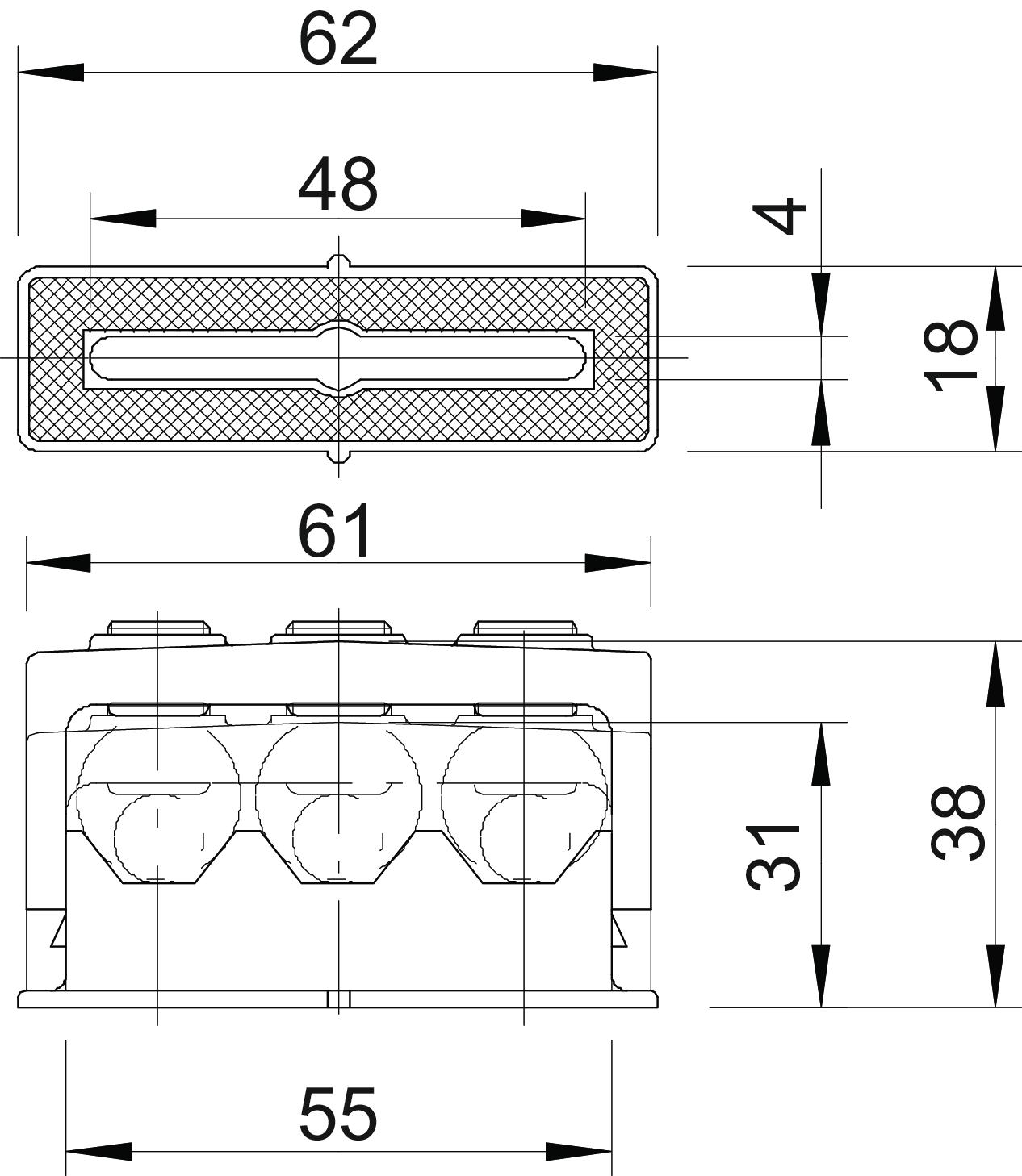 Clamping range D, max. 16 mm Clamping range D, min. 6 mm CO2 Footprint (GWP) Cradle-to-Gate 0,0629 kg CO2e / 1 Piece Colour Light grey; RAL 7035 Dimension 6-16mm Dimension a 62 mm Dimension a1 (mm) 48 mm Dimension b 18 mm Dimension b1 4 mm Dimension c 61 mm Dimension d 31 mm Dimension e 38 mm Dimension f 55 mm Expandable no Fastening type Screw hole Halogen-free yes Impact-resistant yes Material Polystyrene Number of cables/pipes 3 - All types
