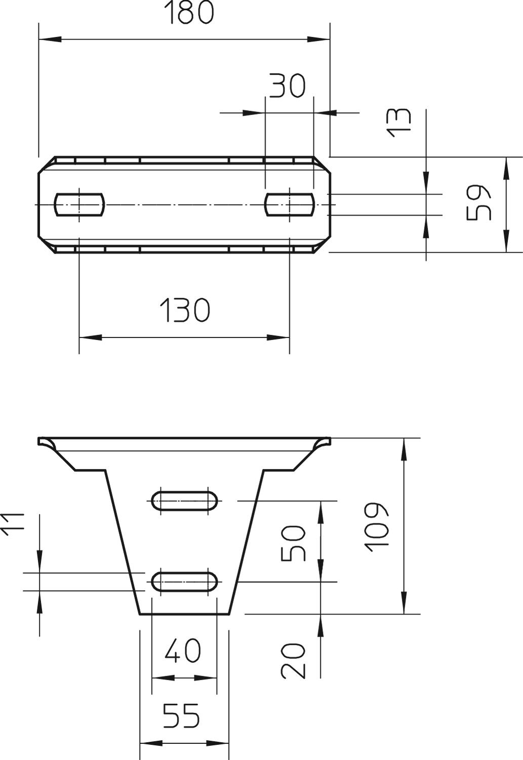 Angle range, max. 30 mm CO2 Footprint (GWP) Cradle-to-Gate 2,79 kg CO2e / 1 Piece Colour zinc Dimension 180x59x109 Height 109 mm Length 180 mm Maintain electrical functions no Material Steel Rustproof steel, pickled no Suitable for ceiling fastening yes Suitable for panel fastening no Suitable for profile shapes U profile Surface Hot-dip galvanised Version for Screw head plate Width 59 mm - All types
