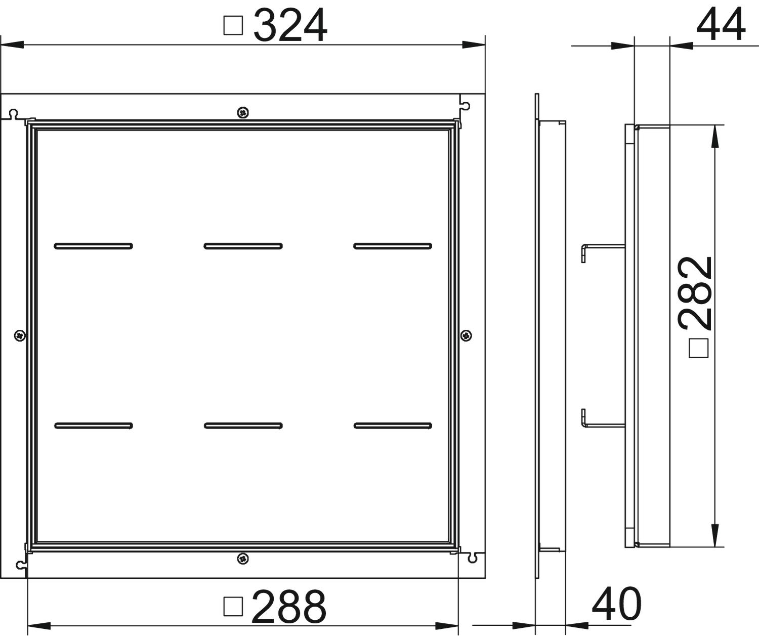 Cable outlet version No cable outlet CO2 Footprint (GWP) Cradle-to-Gate 32,7873 kg CO2e / 1 Piece Device support to accept mounting boxes no Dimension 282x282x40 Dimension A 324 mm Dimension B 288 mm Dimension C 282 mm Dimension h 40 mm Floor care Wet Floor covering thickness 34 mm Floor height, min. 110 mm Heavy load class 20 kN (OBO SL2) Heavy-duty version yes Length of installation dimensions 290 mm Material Stainless steel 1.4301 Protection rating (IP) when unused IP44 Protection rating (IP) when used IP00 Protection rating IK code IK10 Screed height, min. 70 mm Suitable for cavity floor installation yes Suitable for raised floor installation yes Wide installation dimensions 290 mm - All types