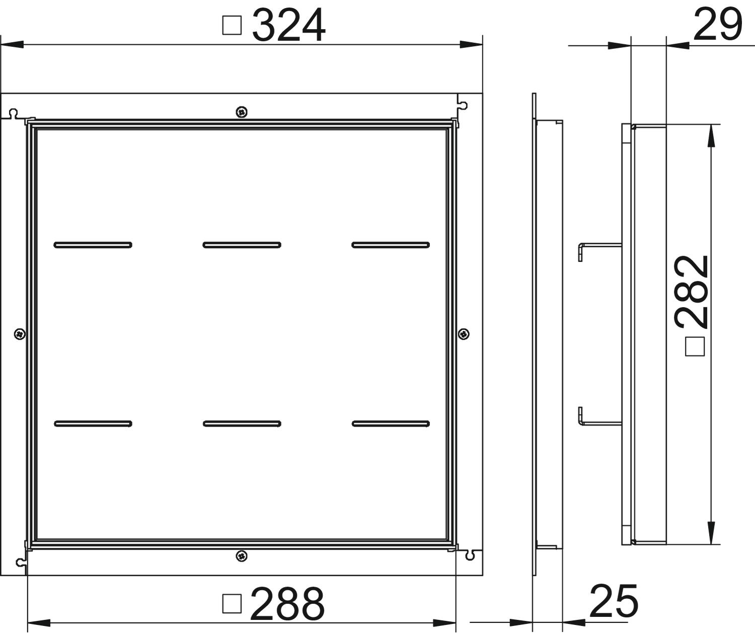 Cable outlet version No cable outlet CO2 Footprint (GWP) Cradle-to-Gate 29,7471 kg CO2e / 1 Piece Device support to accept mounting boxes no Dimension 282x282x25 Dimension A 324 mm Dimension B 288 mm Dimension C 282 mm Dimension h 25 mm Floor care Wet Floor covering thickness 19 mm Floor height, min. 95 mm Heavy load class 20 kN (OBO SL2) Heavy-duty version yes Length of installation dimensions 290 mm Material Stainless steel 1.4301 Protection rating (IP) when unused IP44 Protection rating (IP) when used IP00 Protection rating IK code IK10 Screed height, min. 70 mm Suitable for cavity floor installation yes Suitable for raised floor installation yes Wide installation dimensions 290 mm - All types
