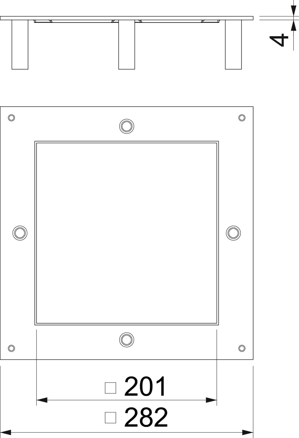 CO2 Footprint (GWP) Cradle-to-Gate 7,8481 kg CO2e / 1 Piece Dimension 282x282x59 Dimension A 282 mm Dimension a 201 mm Floor care Dry Heavy-duty version yes Installation opening for on-floor tank no Length 282 mm Material Steel Material thickness 4 mm Mounting opening Square Mounting opening cover no Nominal size 250 mm Nominal size for device installation units 4 Seal installation option no Suitable for screed-covered underfloor ducts yes Suitable for screed-flush closed underfloor ducts no Surface Strip galvanized Width 282 mm - All types