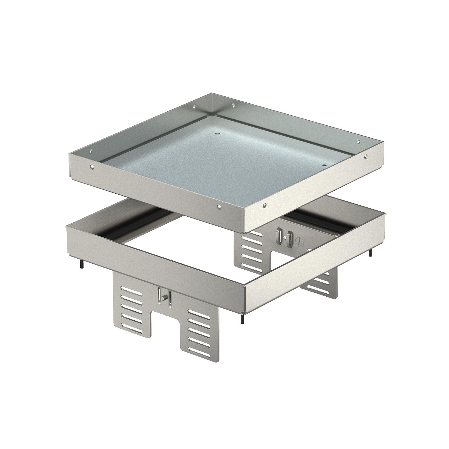 Product descriptionHeight-adjustable "blank" cassette, decoupled from the floor, for the creation of an inspection opening of nominal size 4 in dry or wet-cleaned floors for indoor use, for mounting in underfloor boxes UZD250 or UZD350, either in conjunction with a blanking lid DUG../4 or in UGD250-3/4 or UGD350-3/4. Mounting takes place using levelling profiles (order separately) in the aluminium frame profile of the underfloor boxes. Only suitable for smooth floor coverings.