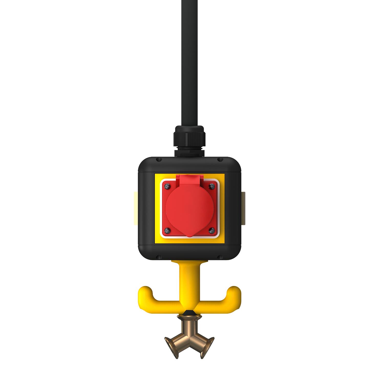 Product descriptionHousing equipped and pre-wired, with 1 m pipe 1/2" and connection for compressed air hose 13 x 3.5 mm and 2-way distributor 1/2", with suspension lug, grip hook and four cover plates.