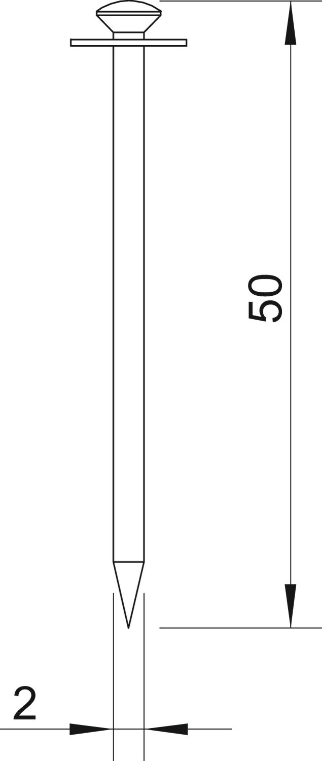Dimension 2x50mm Dimension d 2 mm Dimension L 50 mm Hardened yes Head shape Rounded head Length 50 mm Material Steel Screw nail version no Shaft form Smooth Shank diameter 2 mm Surface Bright Tip shape Chisel tip Version for Impu - All types