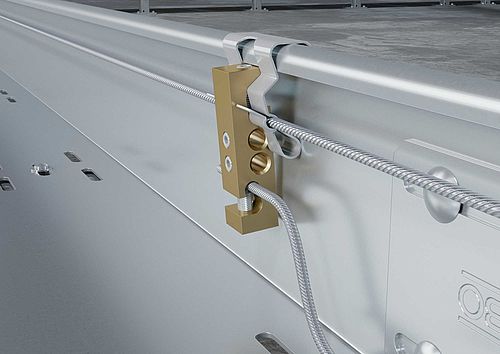 The walkable cable tray system can be integrated quickly and without screws into the functional equipotential bonding using the KFL clamp spring and AKL connection terminal. This guarantees the electrical conductivity according to IEC 61537 – Cable management. The clamp spring is clamped simply to the cable tray rail without additional drilling and the stranded cable is pressed into the clamp spring to create the contact. The connection terminal allows simple creation of branches and suspensions of the stranded cable.