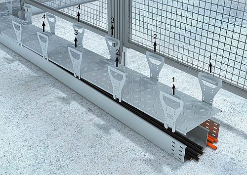 The walkable cable tray system promises variety for any requirements. This also applies to mounting. The cable ducts can be mounted in different ways, thus matching individual requirements. You have the choice: Mounting the anti-slip cable ducts on a support bracket complies with the workplace protection directives to avoid slippage and trip hazards and the step height is maintained. A special protective panel for the support brackets reduces the risk of tripping. The simple and rapid mounting variant of the cable ducts on a Z support profile ensures the step height. The mounting of the hardwearing cable ducts on a Z support also maintains the step height. Protection plates as side panelling reduce the risk of tripping. The simplest and quickest way to route cable ducts for the floor is floor mounting. A small step height and the non-slip properties of the chequer plate cover make safe working possible at any time.