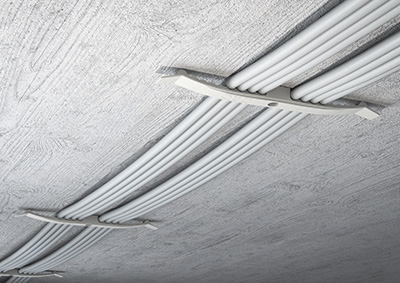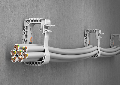 The standard pressure clip versions 2032 and 2033 are suitable for general applications, such as false ceilings and partition wall installation. Pressure clip 2032 is designed for a maximum of 8 cables, while pressure clip 2033 can accommodate up to 16 cables. The correct cable cross-section must not be exceeded. Like the GRIP grouped support, they can be fixed easily using a firing tool, enabling uncomplicated installation with one hand.