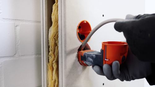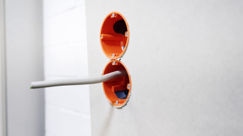 The cavity wall electronics box also offers the option of installing the component in a previously installed box. For this, the NYM cable or data cable is simply inserted through the insertion opening on the rear side of the box. The unit thus created is then placed in the pre-drilled wall opening, immediately guaranteeing secure positioning.