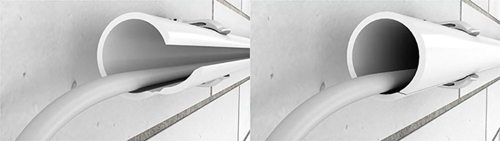 This is how easy the Quick pipe system is to use: The cables are inserted in the open Quick pipe electrical installation pipes in the same way as with open cable ducts. After the cable is inserted, the Quick pipe is twisted in the Quick clip and this simple movement locks it securely in place. The rotary mechanism also ensures that retroinstallations can be performed at any time. The Quick pipe can be opened again very easily by turning it.