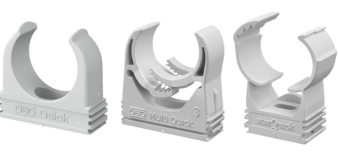 Quick clips are the ideal fastening for the Quick pipe system. Using their arrangement contour, the Quick clips can be interconnected with ease. Thus, users can do without some installation steps, because up to three clips can be mounted with a single drill hole.